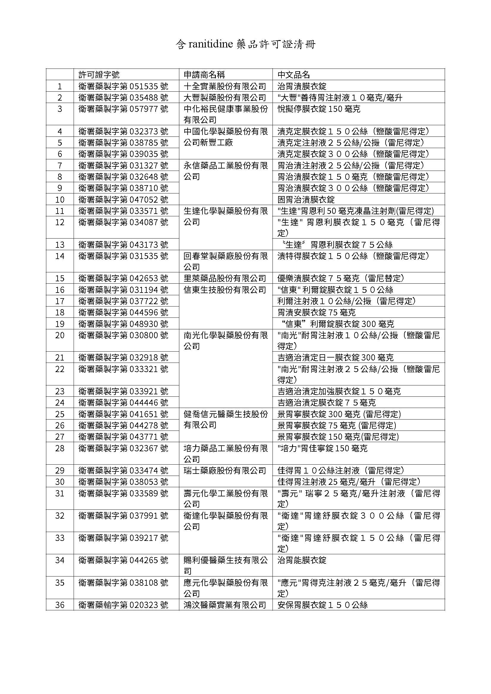 食藥署表示目前我國核准含ranitidine成分之藥品許可證共36張(清單如附件),保存期限多數為2~4年,因無法確保於保存期限屆滿前,其NDMA之含量均能低於每日可接受攝取量96 ng,為確保民眾用藥安全,食藥署爰要求醫療機構、藥商、藥局暫停於國內供應、銷售或使用含ranitidine成分藥品。另食藥署表示已接獲部分業者主動通知,經其評估後已自主啟動市售效期內含ranitidine成分藥品回收作業。